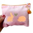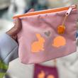 • weicher rosafarbener Samt, oranger Reißverschluss mit Glitzerhasen - und Igel in Neonorange und ein goldenes Glitzerherz