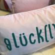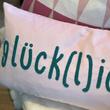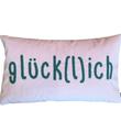 - Material: 100% Polyester, Kissen in hellrosa, Schriftzug "glücklich" in petrol blau